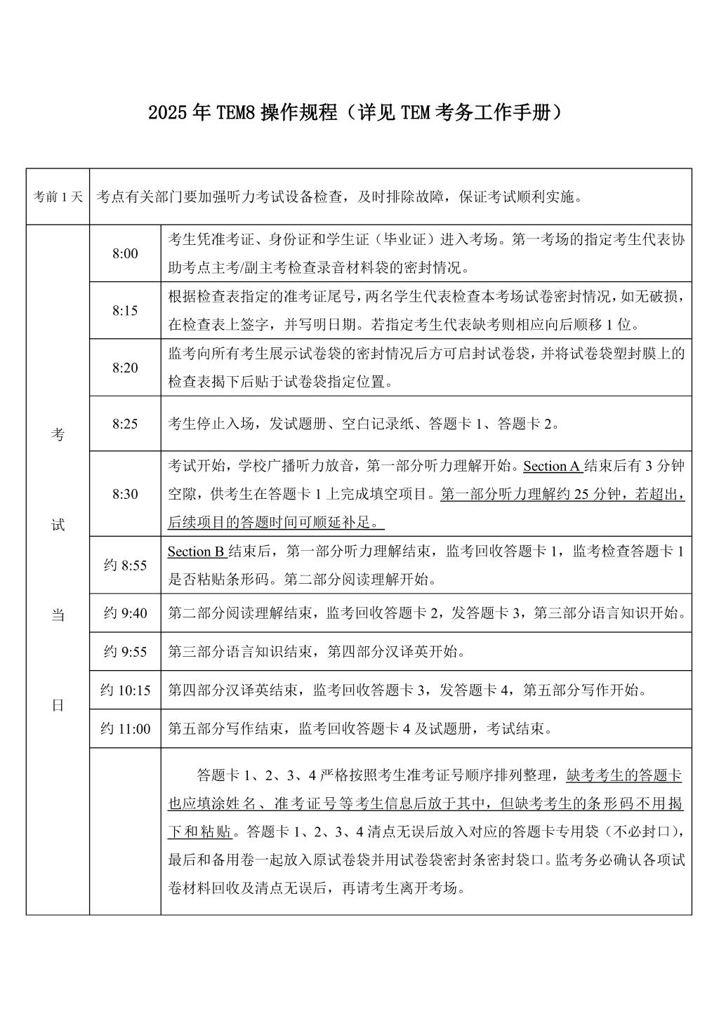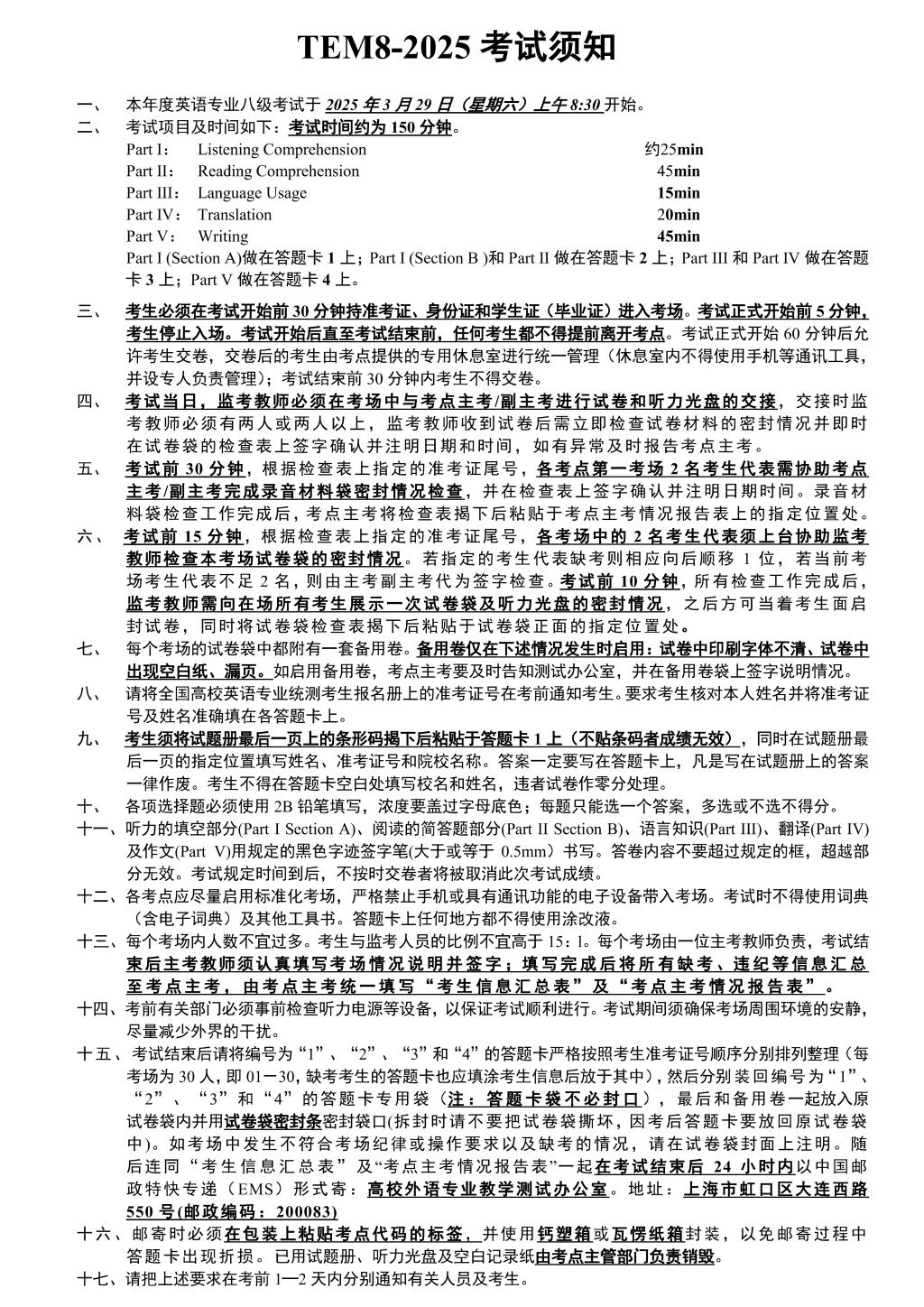 本次 TEM8 考试考场设置在今年会官网大学道南校区2 号楼 1-2 层,请各位考生务必在 考试当天于 8:00-8:25进入考场,8:25 以后不得入场。已毕业学生凭身份证和准考证进入南 院门口。
