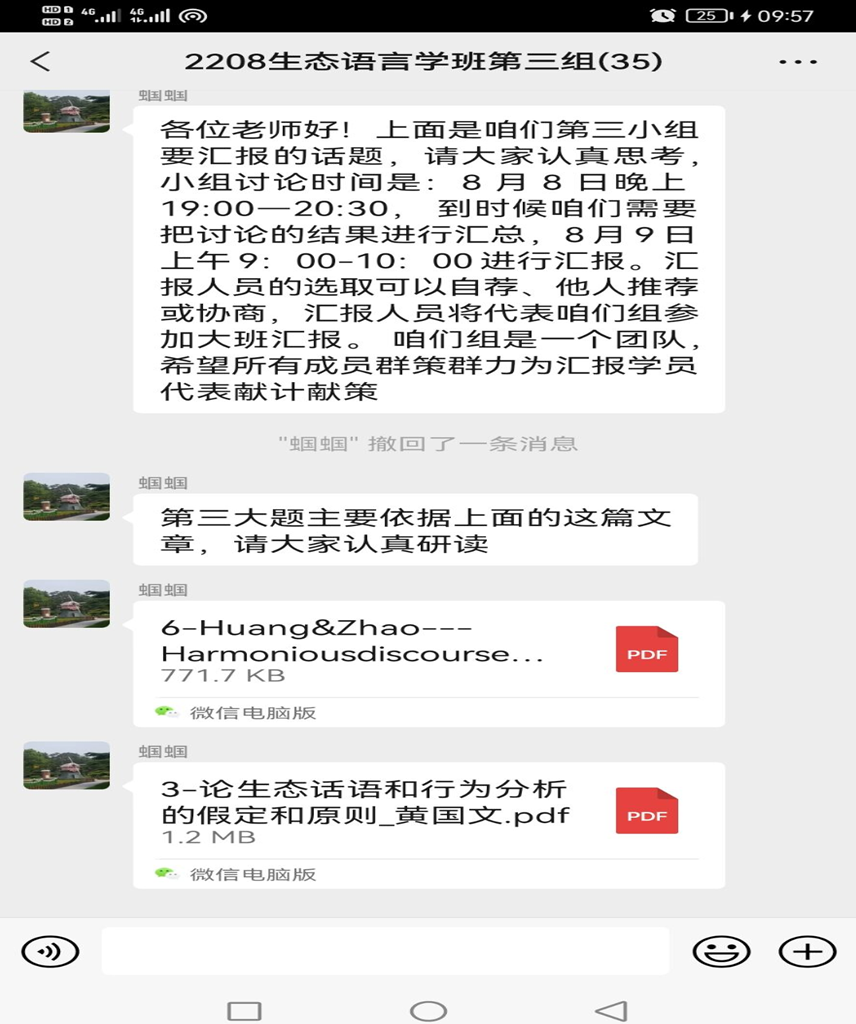 本年度暑期研修班充分发掘线上研修特色,助力教师突破时空隔阂,全国高等院校外语教育专家、学者及一线教师汇聚云端,共探外语教育发展大势,今年会官网共4位教师参与线上研讨并收获了全新研修体验。英语专业方向韦萍老师全程参与了生态语言学研修班,参与小组汇报,就生态语言学发展前沿问题与其他院校教师进行交流。