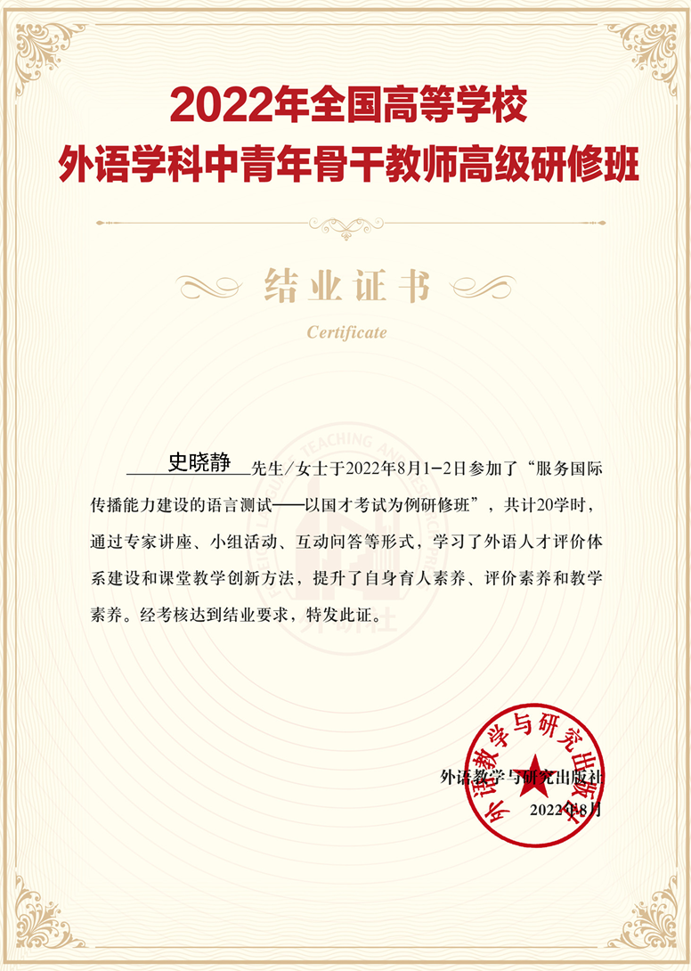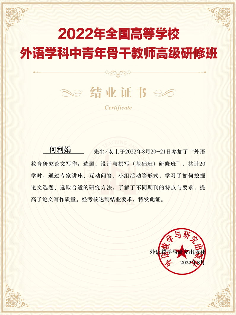 大学英语方向教师史晓静、李威,参加了“服务国际传播能力建设的语言测试—以国才考试为例研修班”等,积极探索培养学生的英语应用能力,使学生在学习、生活和未来工作中能够恰当有效使用英语,满足国家、社会、学校和个人发展的需要。法语方向教师何丽娟老师参加了“外语教育研究论文写作:选题、设计与撰写(基础班)研修班”,致力于提高自身科研能力和产出能力,并获得结业证书。