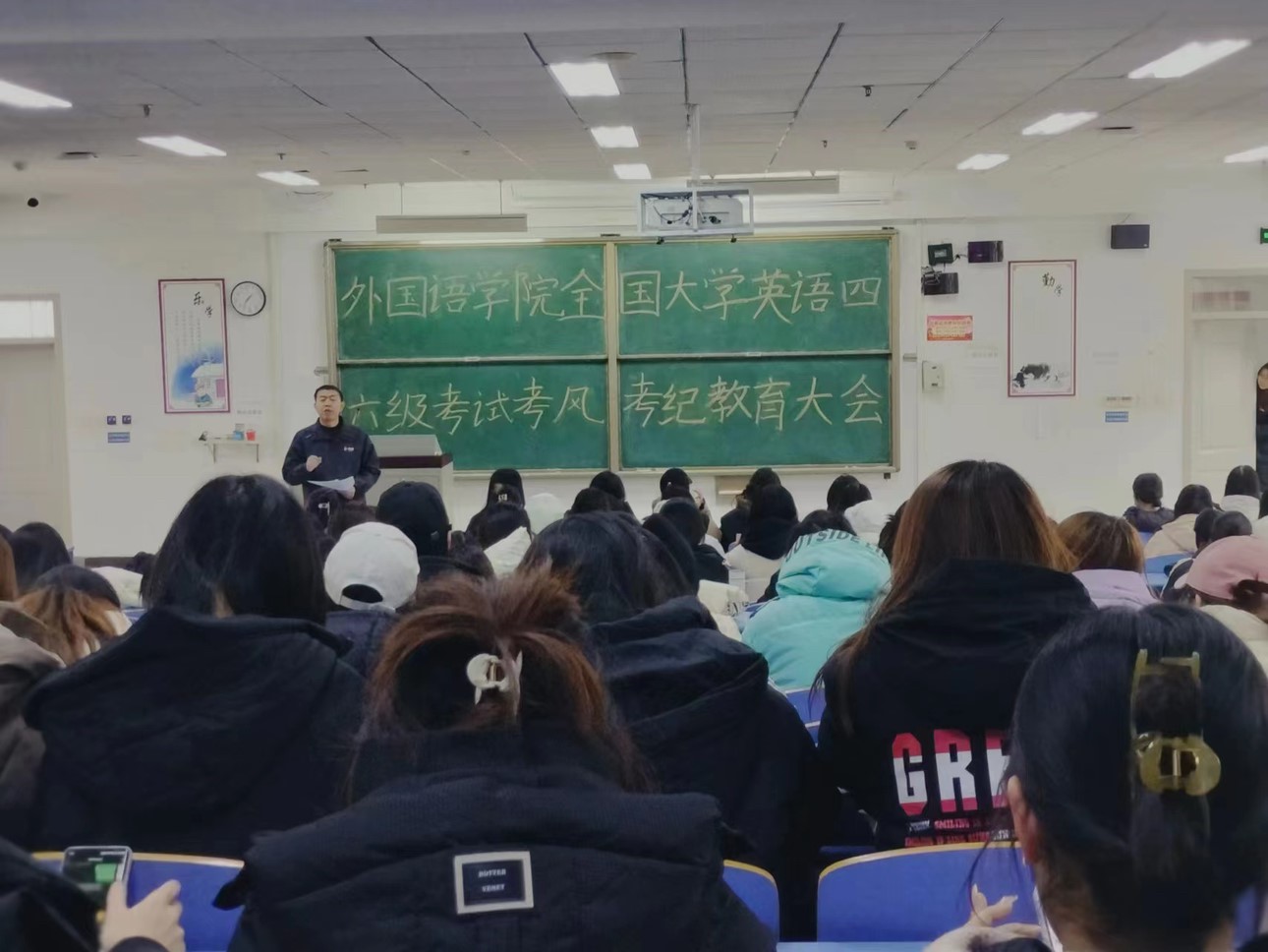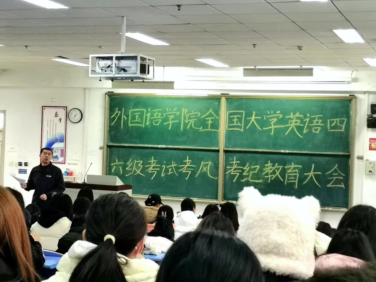 除此之外,为了进一步加强全国大学英语四、六级考试的考风考纪教育,提高考试的公平性和规范性,传达考风考纪对四、六级考试的重要意义,提高学生的考试意识,引导全体考生遵守考试规定,营造良好的考试环境,12月15日,今年会于文十阶梯教室召开了考风考纪教育大会。
