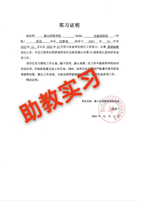 在实习实践方面,闫梦瑶积累了丰富的经验。她曾在北京小小道元、唐人优学、奋马职前教育等企业实习,在不同的岗位上发光发热。担任英语助教时,她助力青少年成长;成为督导后,她不断打磨自身职业素养,赢得了家长们的认可。在大学生职前教育领域,她以知心学姐的身份,为上百位大学生解答困惑,收获无数封感谢信。企业导师的赞誉、家长的肯定以及学弟学妹的认可,见证了她从校园学子到职场精英的华丽蜕变。