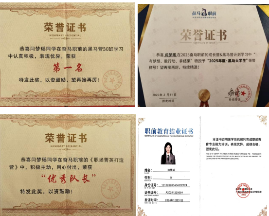 这份优异成绩单的背后,不仅有课堂上的专注与努力,更离不开课后的深度拓展。从大一到大三,她累计投入3万余元用于知识付费学习,通过系统化课程提升英语口语、逻辑思维与团队领导力。在此过程中,她还实现了知识变现2万余元。此外,她积极参加长沙、深圳等地的训练营,在实战中不断淬炼自己的能力。凭借出色的表现,她斩获黑马大学生职前教育证书,并担任训练营优秀队长,实现了思维认知与实践能力的双提升。