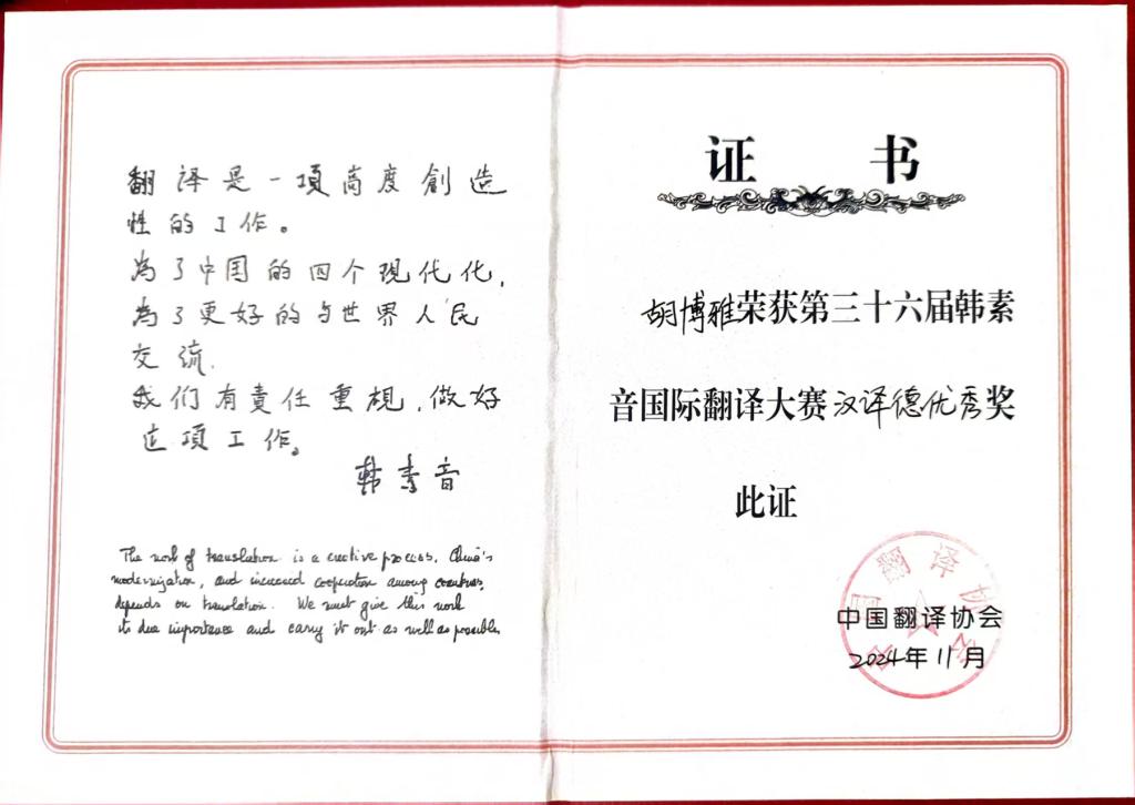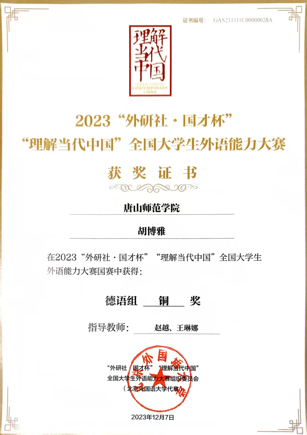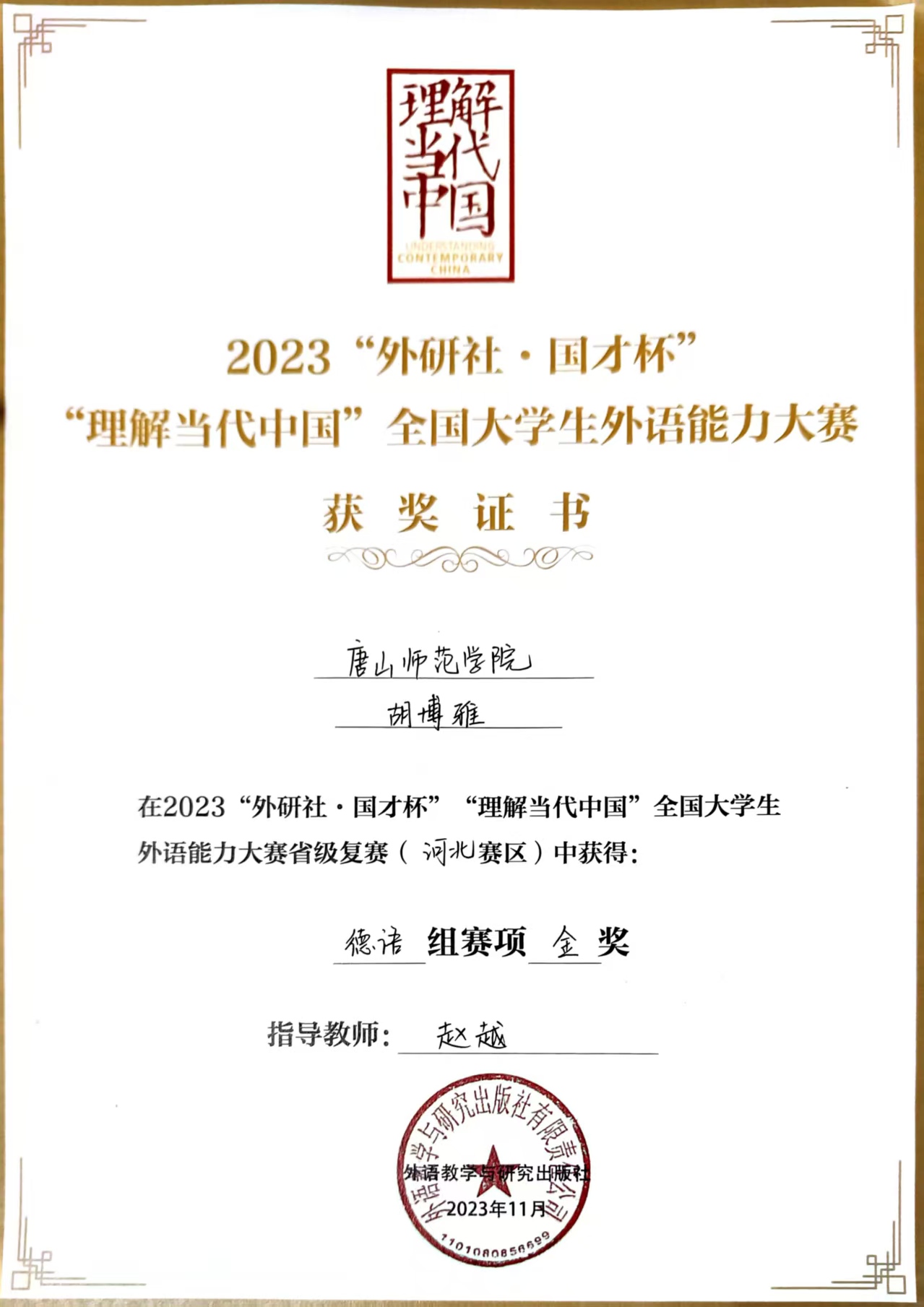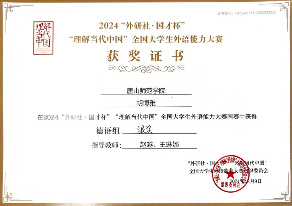 作为德语专业学子,胡博雅同学始终坚持将学术积淀与语言实践深度融合。2024年,她报名参加“理解当代中国·全国大学生外语能力大赛”,在指导老师的悉心帮助下,历经校赛、省赛、国赛的层层角逐,最终斩获德语组全国银奖。备赛期间,她以《习近平谈治国理政》德语版为学习蓝本,通过高频次的阅读、翻译及演讲训练,实现语言能力的全面提升。赛场上,她紧扣“理解中国,沟通世界”主题,巧妙结合德语表达特色与当代中国国际视野,出色完成即兴演讲和口译任务,充分展现了外语专业学生的学术素养与文化传播实力。这段经历让胡博雅同学深刻感悟到,外语学习者不仅需要夯实语言根基,更要锤炼跨文化传播能力,以专业之姿讲好中国故事。这份荣誉也将持续激励她在专业领域深耕不辍,为中外文化交流注入青春力量。