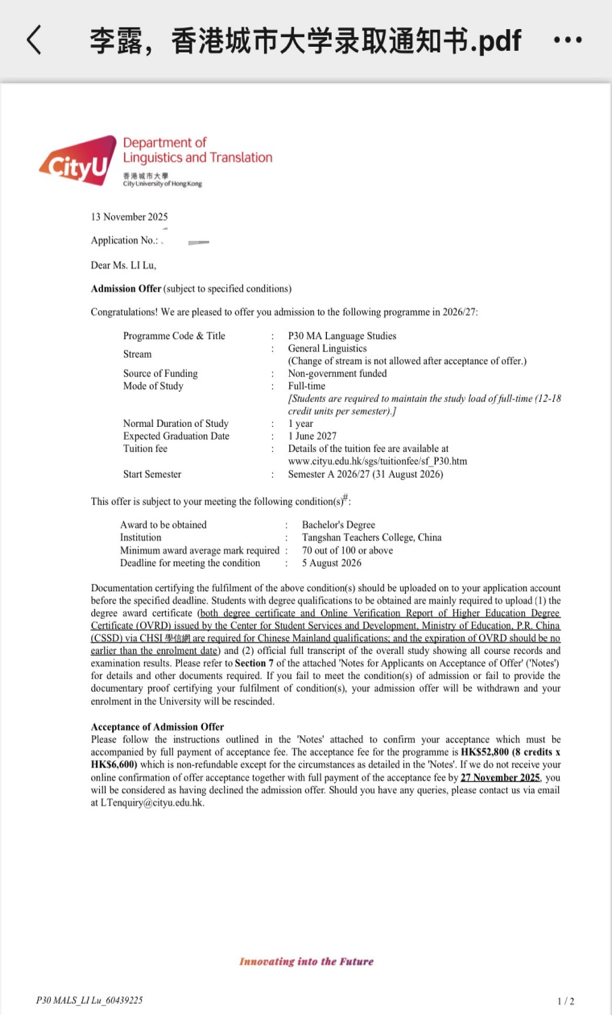 今年会官网今年会2022级英语专业学生李露成功获得香港城市大学的研究生录取通知书。该生成为学院2026届毕业生中首位成功申请至香港地区知名高校的学生,是其个人学业生涯的重要突破,也为学院国际化人才培养提供了有益案例。