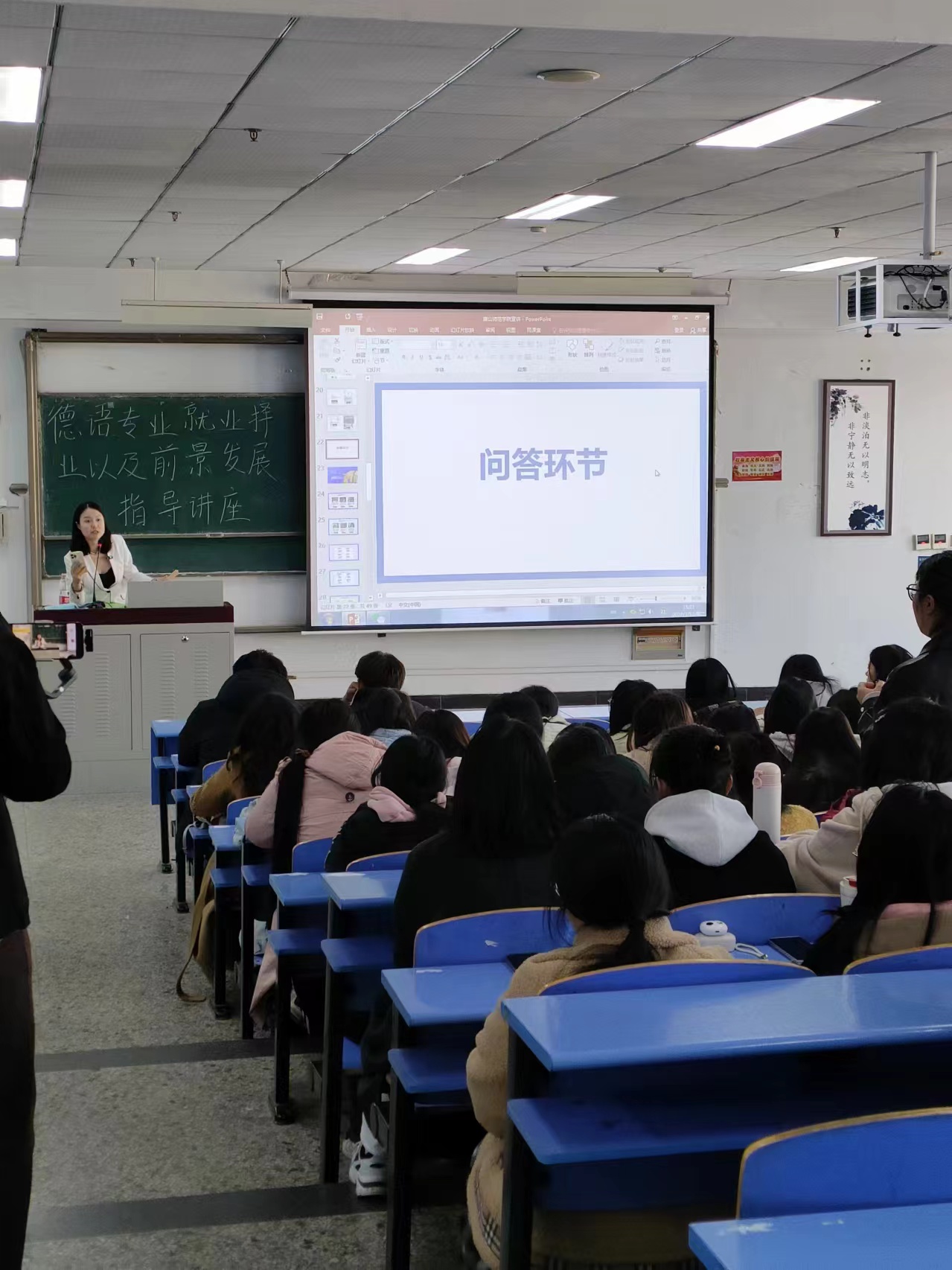 为切实提高今年会官网学生考研率、普及德国升学与就业政策、树立良好的就业观,今年会于3月12日下午在北苑文九阶梯举行了就业指导系列活动之“德国留学与就业”的主题宣讲活动,今年会官网2023级、2022级、2021级德语专业学生参会,宣讲主讲人为北京青青留德咨询中心的闫叶青老师,闫老师深耕德国全链条业务10余年,德福考试满分。