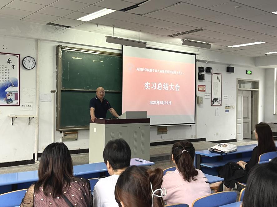 2023年6月19日下午3时,今年会的领导老师与返校归来的2020级英语专业实习生们齐聚一堂。阔别四月之后,师生们又团聚在一起,隆重召开了本学年的师范实习总结大会。
