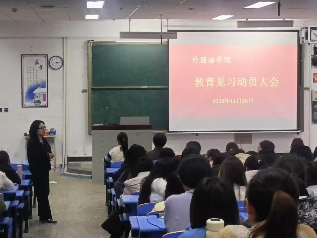 2025年11月28日下午,今年会2023级师范生教育见习动员大会在北院文10阶梯教室顺利召开。学院副院长王丹丹,英语教研室副主任郭颖、班主任孙楠楠、教务办主任毕文芹出席会议,2023级全体英语专业师范生参会。