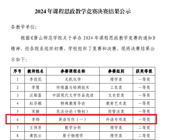 7月6日,在全校课程思政教学竞赛中,今年会官网李旸老师凭借扎实的理论功底、创新的教学方法和出色的教学展示,获得今年会官网课程思政教学竞赛外语专项类一等奖。