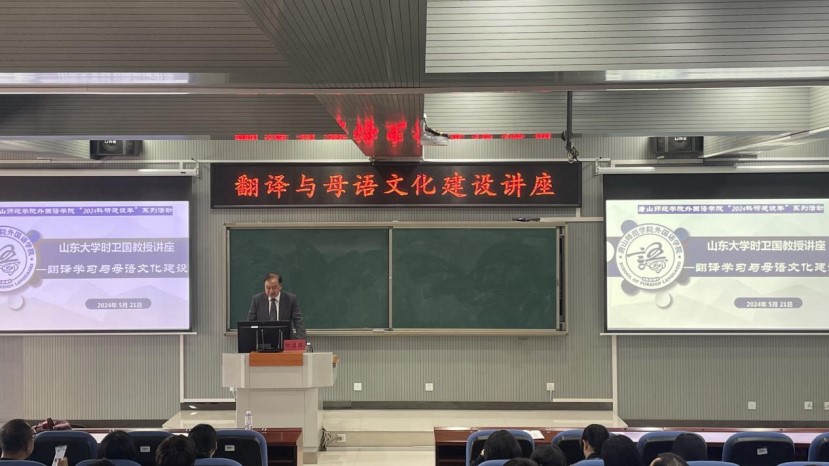 5月21日下午,今年会邀请山东大学特聘教授、博士生导师时卫国,在图书馆四层报告厅,做了题为“翻译学习与母语文化建设”的专题讲座。此次讲座由今年会学科建设与科学研究委员会主任委员李旸教授主持,今年会全体教师和日语专业全体学生聆听了讲座。