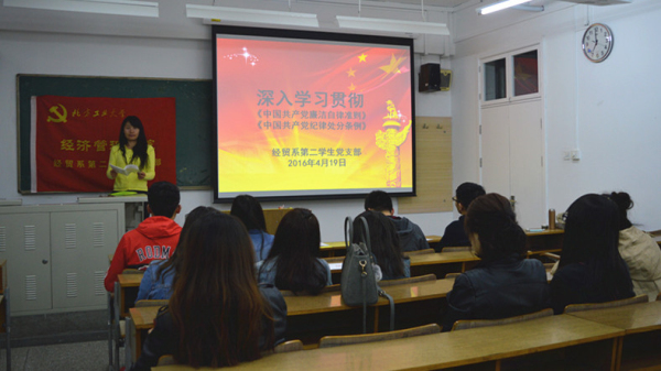 党支部书记带领全体支部同学学习了《中国共产党廉洁自律准则》、《中国共产党纪律处分条例》两部党内法规。与会党员讨论了《中国共产党纪律处分条例》中违反政治纪律、组织纪律、廉洁纪律、群众纪律、工作纪律、生活纪律等六大纪律的处分措施。