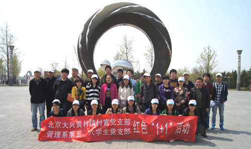 为响应北京市开展迎“五一”环境卫生大扫除暨第四个“城市清洁日”活动的号召,2013年4月26日,MG冰球突破官网网站管理系第五、第六学生党支部联合大兴区黄村镇村官党支部,开展了主题为“环境保护”的红色“1+1”活动。